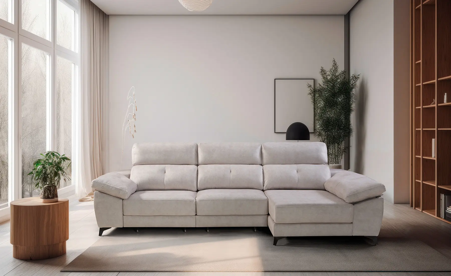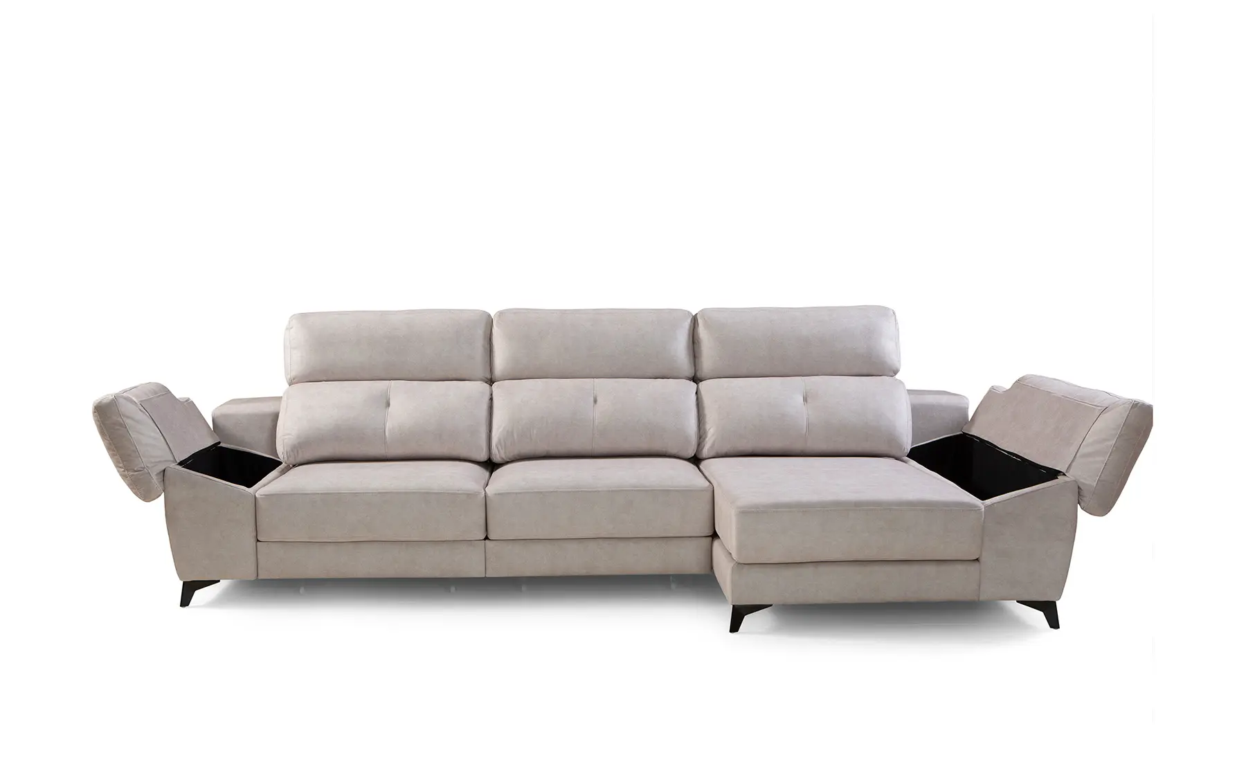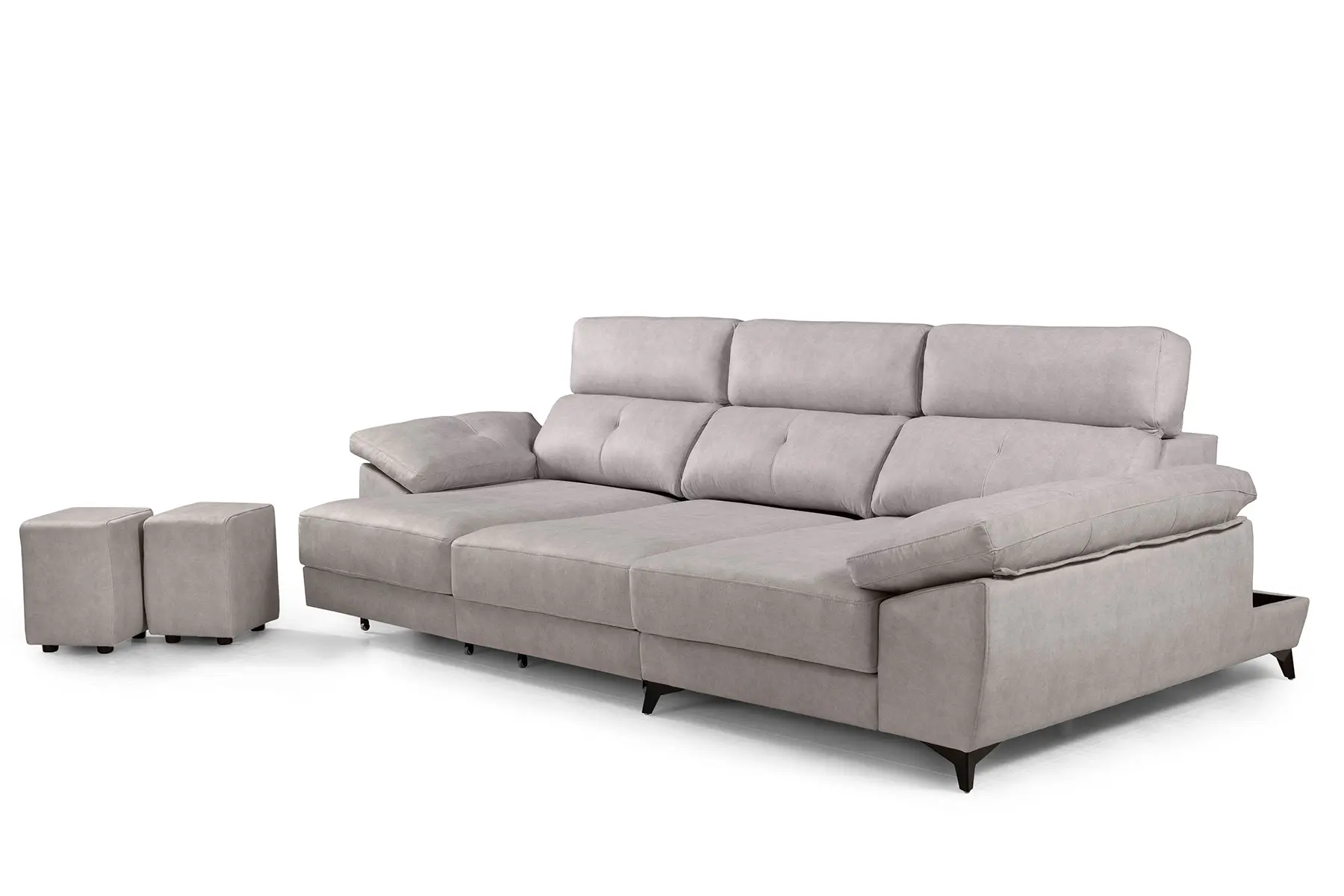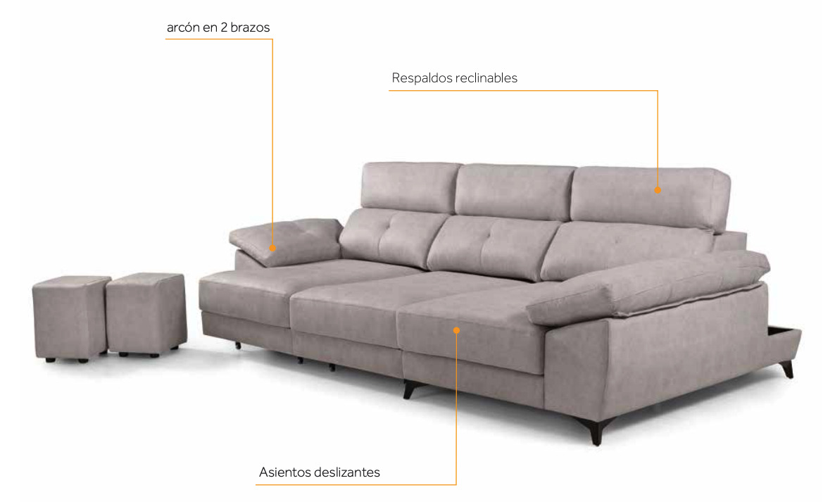 Disfruta de las amplias posibilidades de adaptación a tu hogar que te brinda este sofá con asientos deslizantes, respaldos reclinables, arcones en brazos y útiles poufs a juego.